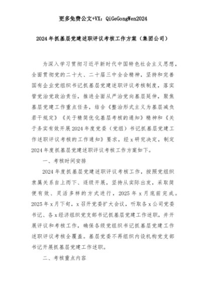 【七哥公文】2025年:2024年抓基层党建述职评议考核工作方案(集团公司)+更多免费公文+VX:QiGeGongWen2024+更多免费公文+VX:QiGeGongWen2024