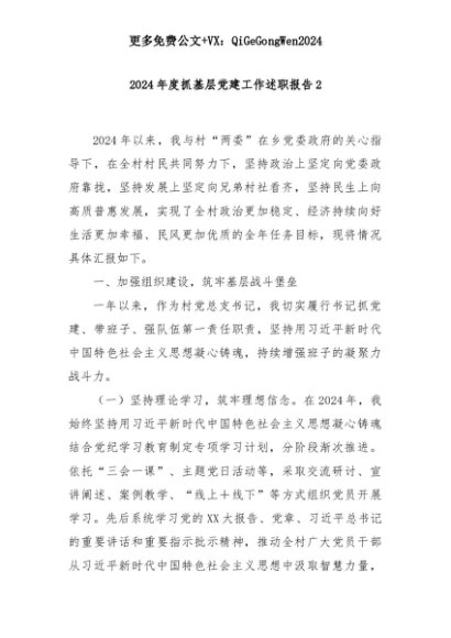 【七哥公文】2025年:2024年度抓基层党建工作述职报告2+更多免费公文+VX:QiGeGongWen2024+更多免费公文+VX:QiGeGongWen2024
