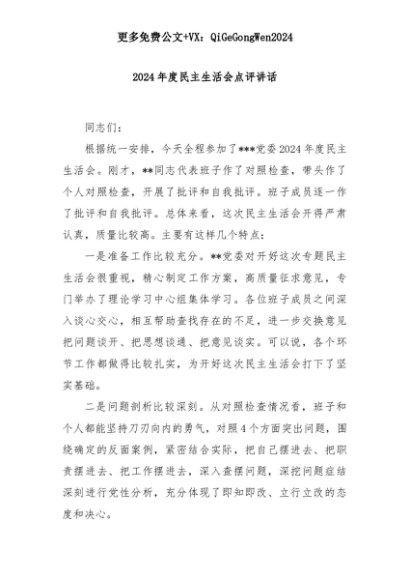 【七哥公文】2025年:2024年度民主生活会点评讲话+更多免费公文+VX:QiGeGongWen2024+更多免费公文+VX:QiGeGongWen2024