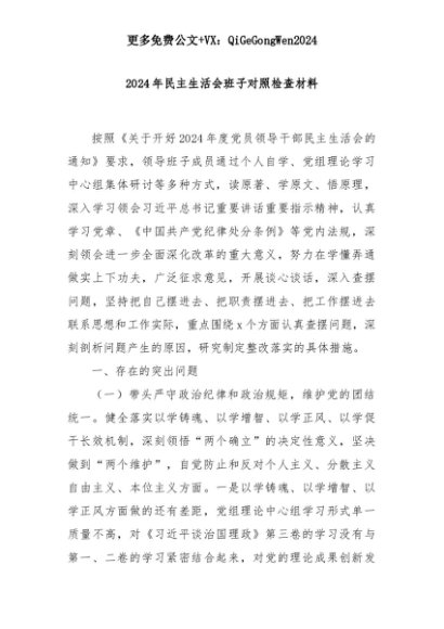 【七哥公文】2025年:2024年民主生活会班子对照检查材料+更多免费公文+VX:QiGeGongWen2024+更多免费公文+VX:QiGeGongWen2024