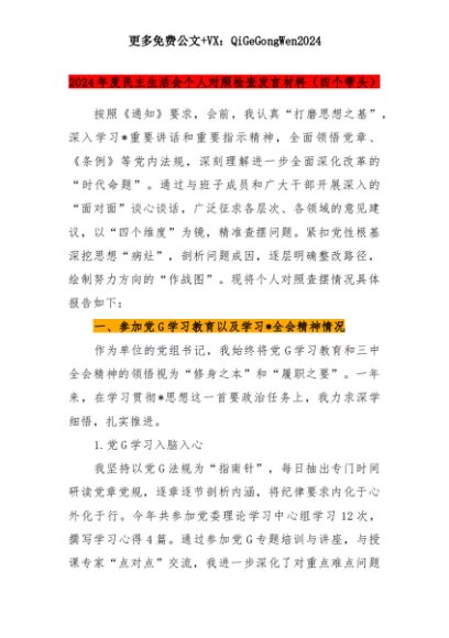 【七哥公文】2025年:2024年度民主生活会个人对照检查发言材料(四个带头)+更多免费公文+VX:QiGeGongWen2024+更多免费公文+VX:QiGeGongWen2024