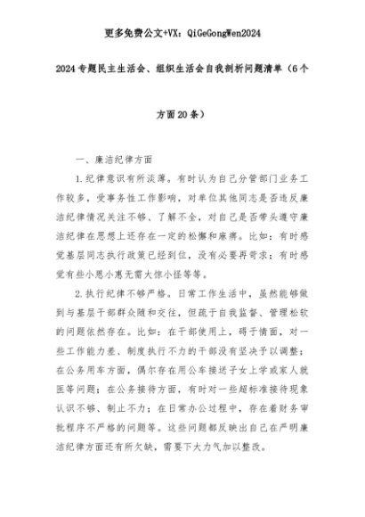 【七哥公文】2025年:(6个方面20条)2024专题民主生活会、组织生活会自我剖析问题清单+更多免费公文+VX:QiGeGongWen2024+更多免费公文+VX:QiGeGongWen2024
