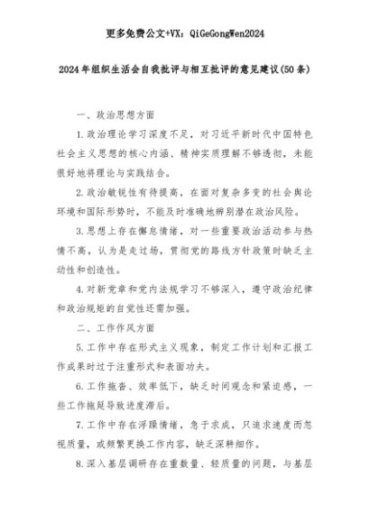 【七哥公文】2025年:(50条)2024年组织生活会自我批评与相互批评的意见建议+更多免费公文+VX:QiGeGongWen2024+更多免费公文+VX:QiGeGongWen2024