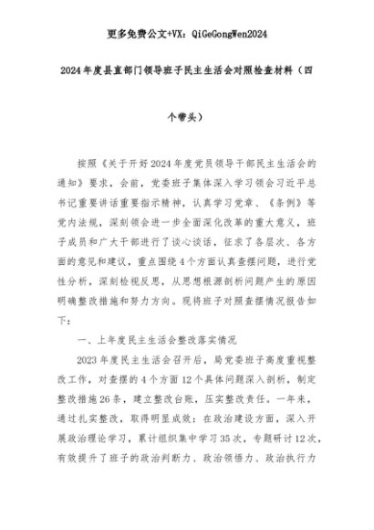 【七哥公文】2025年:2024年度县直部门领导班子民主生活会对照检查材料(四个带头)+更多免费公文+VX:QiGeGongWen2024+更多免费公文+VX:QiGeGongWen2024