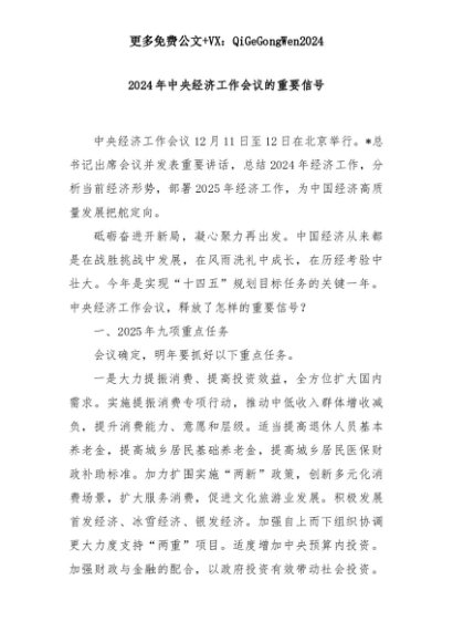 【七哥公文】2025年:2024年中央经济工作会议的重要信号+更多免费公文+VX:QiGeGongWen2024+更多免费公文+VX:QiGeGongWen2024