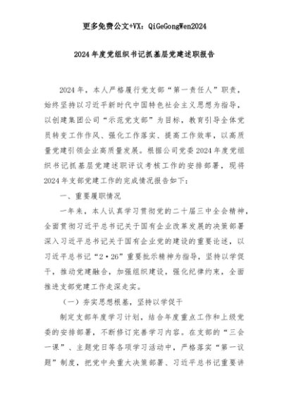 【七哥公文】2025年:2024年度党组织书记抓基层党建述职报告+更多免费公文+VX:QiGeGongWen2024+更多免费公文+VX:QiGeGongWen2024