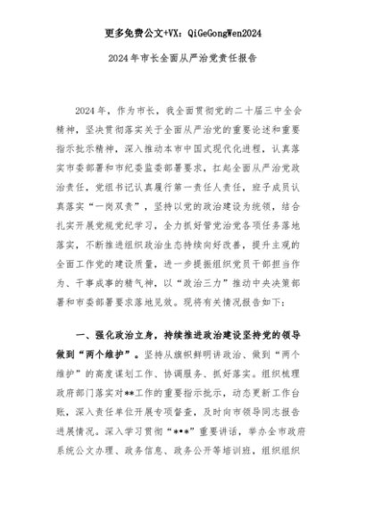 【七哥公文】2025年:2024年市长全面从严治党责任报告+更多免费公文+VX:QiGeGongWen2024+更多免费公文+VX:QiGeGongWen2024