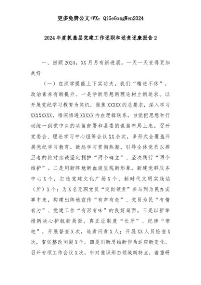 【七哥公文】2025年:2024年度抓基层党建工作述职和述责述廉报告2+更多免费公文+VX:QiGeGongWen2024+更多免费公文+VX:QiGeGongWen2024