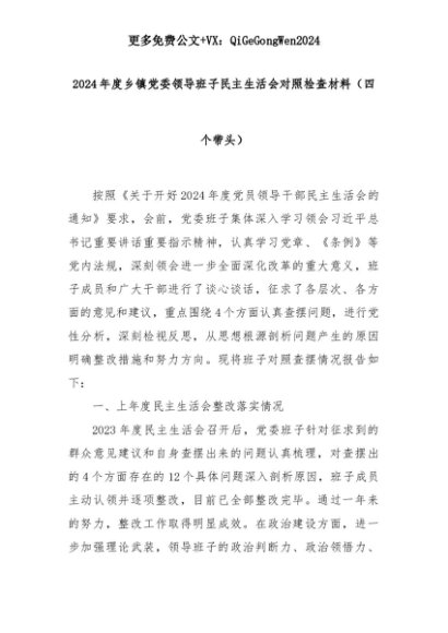 【七哥公文】2025年:2024年度乡镇党委领导班子民主生活会对照检查材料(四个带头)+更多免费公文+VX:QiGeGongWen2024+更多免费公文+VX:QiGeGongWen2024