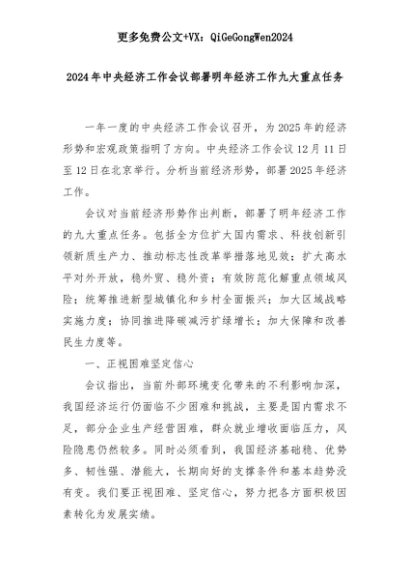 【七哥公文】2025年:2024年中央经济工作会议部署明年经济工作九大重点任务+更多免费公文+VX:QiGeGongWen2024+更多免费公文+VX:QiGeGongWen2024