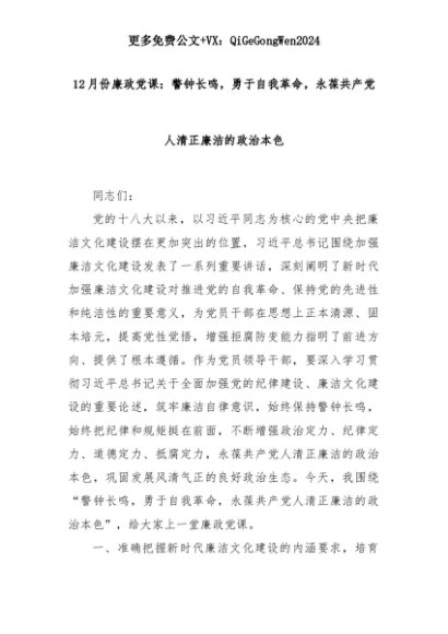 【七哥公文】2025年:12月份廉政党课:警钟长鸣,勇于自我革命,永葆共产党人清正廉洁的政治本色+更多免费公文+VX:QiGeGongWen2024+更多免费公文+VX:QiGeGongWen2024