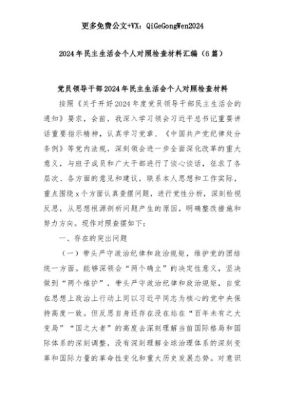 【七哥公文】2025年:(6篇)2024年民主生活会个人对照检查材料汇编+更多免费公文+VX:QiGeGongWen2024+更多免费公文+VX:QiGeGongWen2024