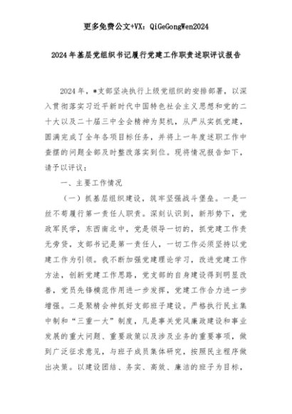 【七哥公文】2025年:2024年基层党组织书记履行党建工作职责述职评议报告+更多免费公文+VX:QiGeGongWen2024+更多免费公文+VX:QiGeGongWen2024