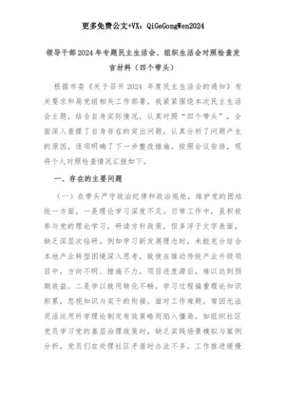 【七哥公文】2025年:领导干部2024年专题民主生活会、组织生活会对照检查发言材料(四个带头)+更多免费公文+VX:QiGeGongWen2024+更多免费公文+VX:QiGeGongWen2024