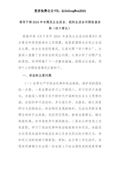 【七哥公文】2025年:领导干部2024年专题民主生活会、组织生活会对照检查材料(四个带头)+更多免费公文+VX:QiGeGongWen2024+更多免费公文+VX:QiGeGongWen2024