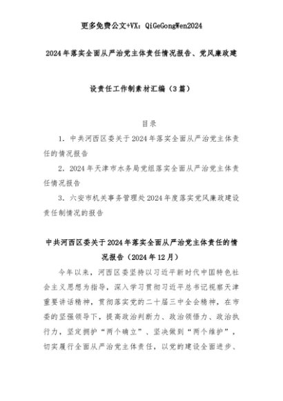 【七哥公文】2025年:(3篇)2024年落实全面从严治党主体责任情况报告、党风廉政建设责任工作制素材汇编(三)+更多免费公文+VX:QiGeGongWen2024+更多免费公文+VX:QiGeGongWen2024