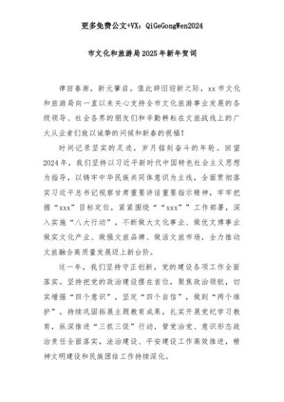 【七哥公文】2025年:市文化和旅游局2025年新年贺词+更多免费公文+VX:QiGeGongWen2024+更多免费公文+VX:QiGeGongWen2024