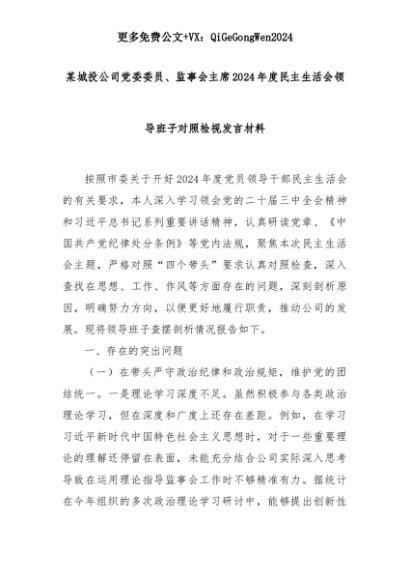 【七哥公文】2025年:某城投公司党委委员、监事会主席2024年度民主生活会领导班子对照检视发言材料+更多免费公文+VX:QiGeGongWen2024+更多免费公文+VX:QiGeGongWen2024