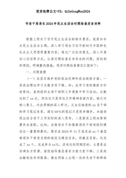 【七哥公文】2025年:市老干局局长2024年民主生活会对照检查发言材料+更多免费公文+VX:QiGeGongWen2024+更多免费公文+VX:QiGeGongWen2024