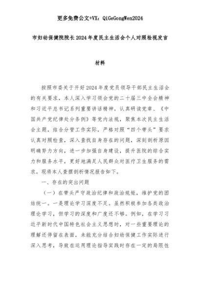 【七哥公文】2025年:市妇幼保健院院长2024年度民主生活会个人对照检视发言材料+更多免费公文+VX:QiGeGongWen2024+更多免费公文+VX:QiGeGongWen2024
