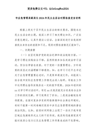 【七哥公文】2025年:市应急管理局副局长2024年民主生活会对照检查发言材料+更多免费公文+VX:QiGeGongWen2024+更多免费公文+VX:QiGeGongWen2024