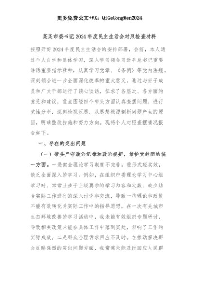 【七哥公文】2025年:某某市委书记2024年度民主生活会对照检查材料+更多免费公文+VX:QiGeGongWen2024+更多免费公文+VX:QiGeGongWen2024