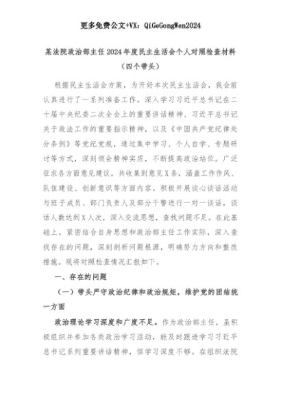 【七哥公文】2025年:某法院政治部主任2024年度民主生活会个人对照检查材料(四个带头)+更多免费公文+VX:QiGeGongWen2024+更多免费公文+VX:QiGeGongWen2024