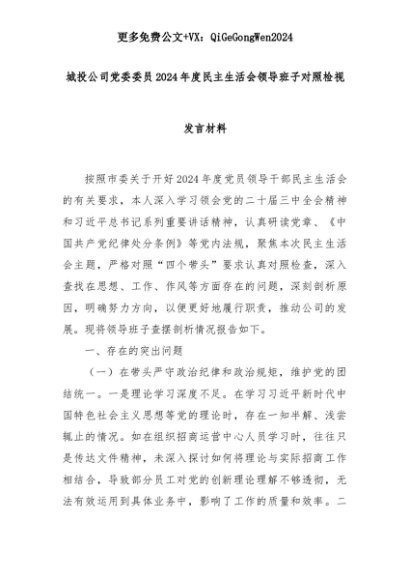 【七哥公文】2025年:城投公司党委委员2024年度民主生活会领导班子对照检视发言材料+更多免费公文+VX:QiGeGongWen2024+更多免费公文+VX:QiGeGongWen2024