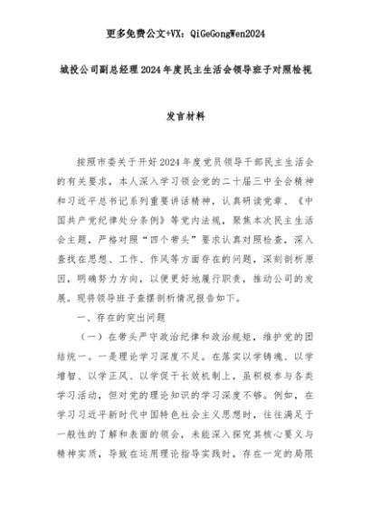 【七哥公文】2025年:城投公司副总经理2024年度民主生活会领导班子对照检视发言材料+更多免费公文+VX:QiGeGongWen2024+更多免费公文+VX:QiGeGongWen2024