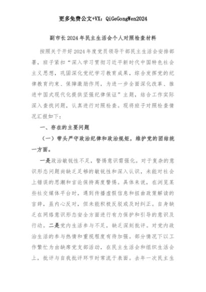 【七哥公文】2025年:副市长2024年民主生活会个人对照检查材料+更多免费公文+VX:QiGeGongWen2024+更多免费公文+VX:QiGeGongWen2024
