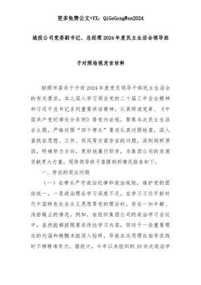【七哥公文】2025年:城投公司党委副书记、总经理2024年度民主生活会领导班子对照检视发言材料+更多免费公文+VX:QiGeGongWen2024+更多免费公文+VX:QiGeGongWen2024