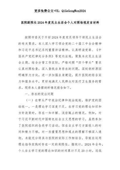 【七哥公文】2025年:医院副院长2024年度民主生活会个人对照检视发言材料+更多免费公文+VX:QiGeGongWen2024+更多免费公文+VX:QiGeGongWen2024