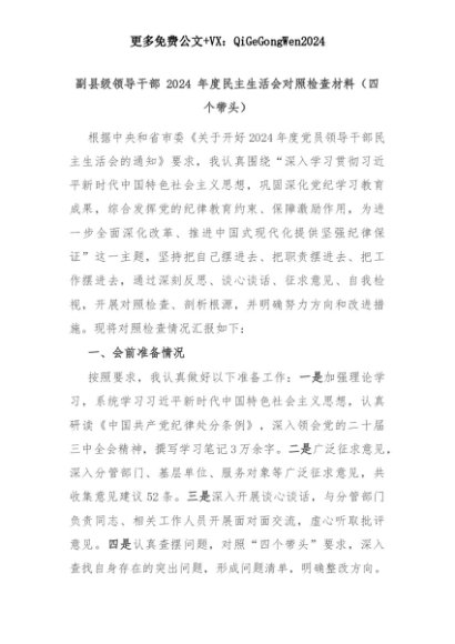 【七哥公文】2025年:副县级领导干部 2024 年度民主生活会对照检查材料(四个带头)+更多免费公文+VX:QiGeGongWen2024+更多免费公文+VX:QiGeGongWen2024
