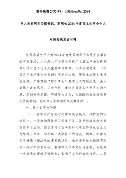 【七哥公文】2025年:市人民医院党委副书记、副院长2024年度民主生活会个人对照检视发言材料+更多免费公文+VX:QiGeGongWen2024+更多免费公文+VX:QiGeGongWen2024