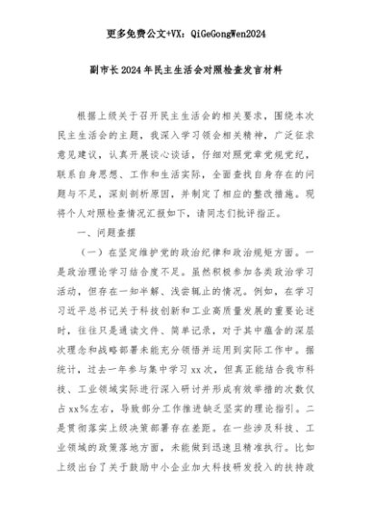 【七哥公文】2025年:副市长2024年民主生活会对照检查发言材料+更多免费公文+VX:QiGeGongWen2024+更多免费公文+VX:QiGeGongWen2024
