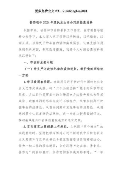 【七哥公文】2025年:县委领导2024年度民主生活会对照检查材料+更多免费公文+VX:QiGeGongWen2024+更多免费公文+VX:QiGeGongWen2024
