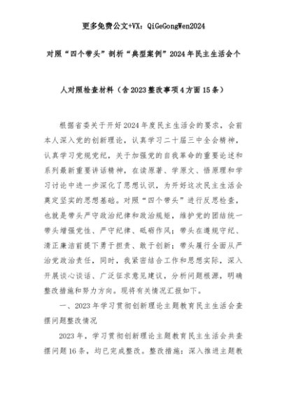 【七哥公文】2025年:对照“四个带头”剖析“典型案例”2024年民主生活会个人对照检查材料(含2023整改事项4方面15条)+更多免费公文+VX:QiGeGongWen2024+更多免费公文+VX:QiGeGongWen2024