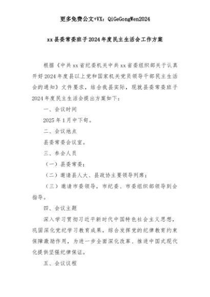 【七哥公文】2025年:xx县委常委班子2024年度民主生活会工作方案+更多免费公文+VX:QiGeGongWen2024+更多免费公文+VX:QiGeGongWen2024
