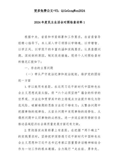 【七哥公文】2025年:2024年度民主生活会对照检查材料1+更多免费公文+VX:QiGeGongWen2024+更多免费公文+VX:QiGeGongWen2024