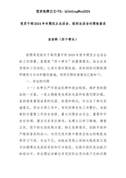 【七哥公文】2025年:党员干部2024年专题民主生活会、组织生活会对照检查发言材料(四个带头)+更多免费公文+VX:QiGeGongWen2024+更多免费公文+VX:QiGeGongWen2024