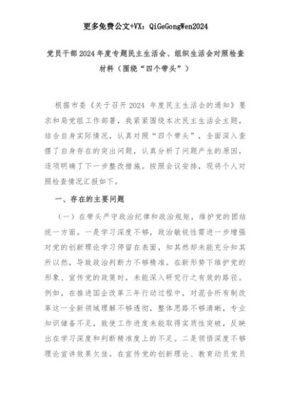 【七哥公文】2025年:党员干部2024年度专题民主生活会、组织生活会对照检查材料(围绕“四个带头”)+更多免费公文+VX:QiGeGongWen2024+更多免费公文+VX:QiGeGongWen2024
