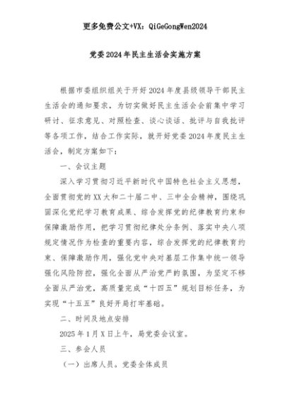 【七哥公文】2025年:党委2024年民主生活会实施方案+更多免费公文+VX:QiGeGongWen2024+更多免费公文+VX:QiGeGongWen2024