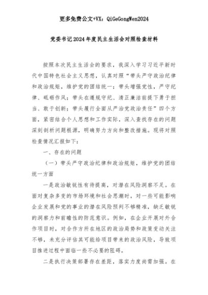 【七哥公文】2025年:党委书记2024年度民主生活会对照检查材料+更多免费公文+VX:QiGeGongWen2024+更多免费公文+VX:QiGeGongWen2024