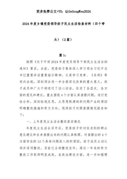【七哥公文】2025年:(2篇)2024年度乡镇党委领导班子民主生活检查材料(四个带头)+更多免费公文+VX:QiGeGongWen2024+更多免费公文+VX:QiGeGongWen2024
