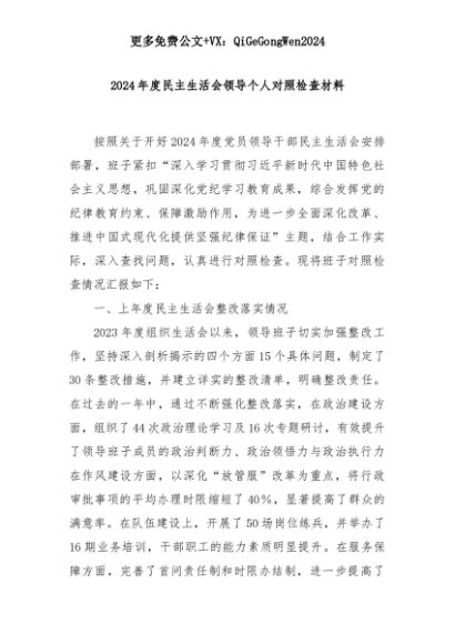 【七哥公文】2025年:2024年度民主生活会领导个人对照检查材料+更多免费公文+VX:QiGeGongWen2024+更多免费公文+VX:QiGeGongWen2024