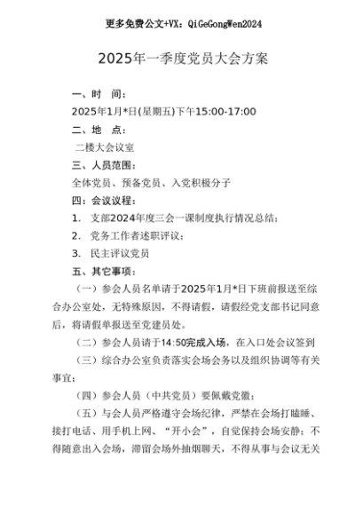 【七哥公文】2025年:03-2025年一季度党员大会方案(1月版)+更多免费公文+VX:QiGeGongWen2024+更多免费公文+VX:QiGeGongWen2024