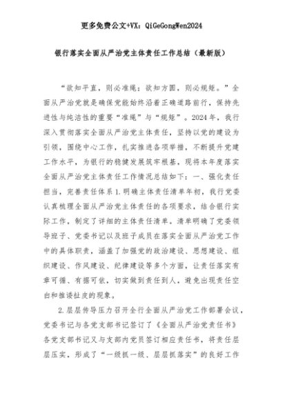 【七哥公文】2025年:银行落实全面从严治党主体责任工作总结(最新版)+更多免费公文+VX:QiGeGongWen2024+更多免费公文+VX:QiGeGongWen2024