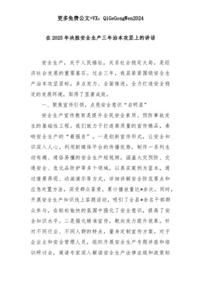 【七哥公文】2025年:在2025年决胜安全生产三年治本攻坚上的讲话+更多免费公文+VX:QiGeGongWen2024+更多免费公文+VX:QiGeGongWen2024