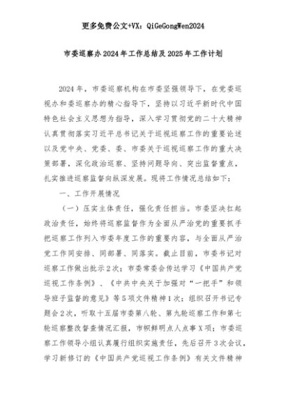 【七哥公文】2025年:市委巡察办 2024 年工作总结及 2025 年工作计划+更多免费公文+VX:QiGeGongWen2024+更多免费公文+VX:QiGeGongWen2024