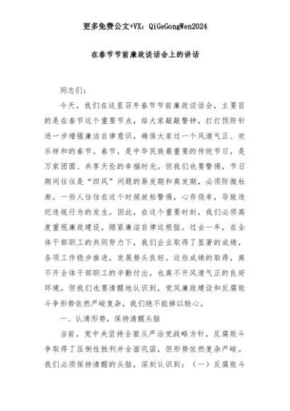 【七哥公文】2025年:在春节节前廉政谈话会上的讲话+更多免费公文+VX:QiGeGongWen2024+更多免费公文+VX:QiGeGongWen2024